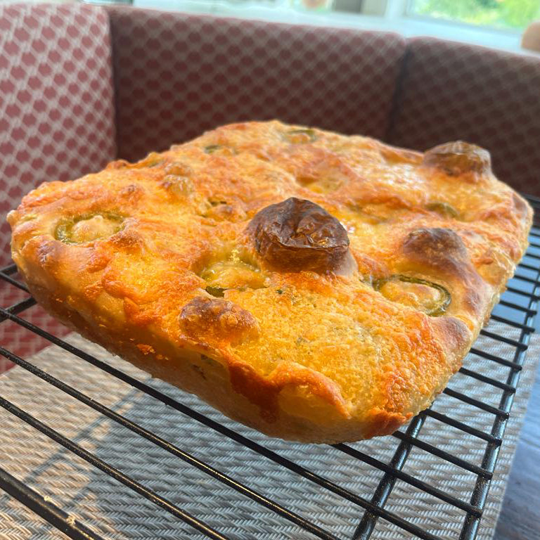 Cheddar Jalapeño sourdough fokattia topped with slices of jalapeño peppers and everyone’s favorite Tillamook cheddar cheese.
