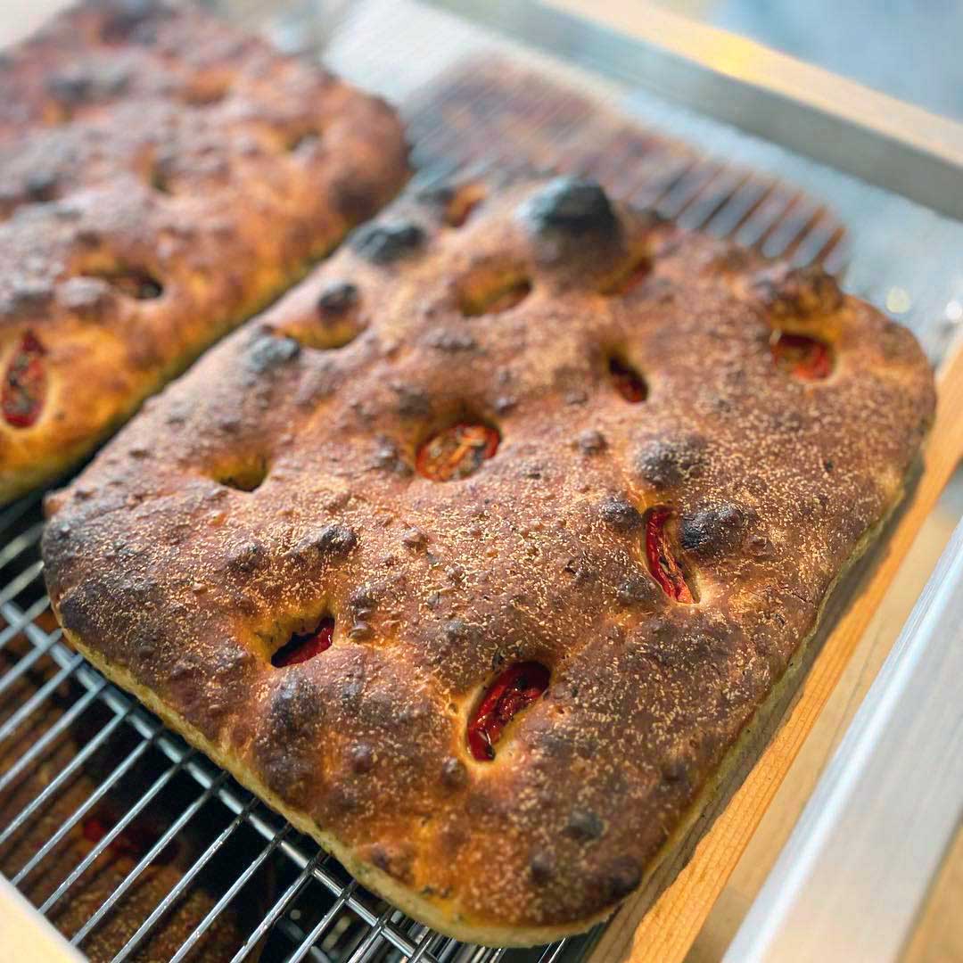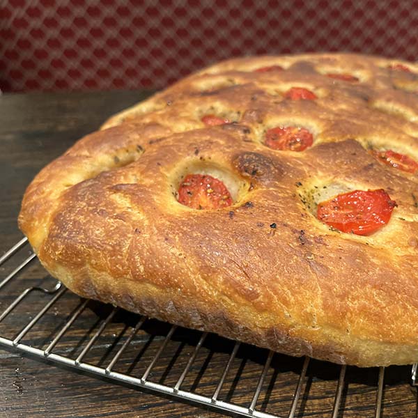Signature tomato sourdough focaccia made with premium Italian Selezione Pizza Tipo 00 Flour, and topped with extra virgin olive oil and marinated cherry tomatoes. Very aromatic with wonderful flavor herbes de Provence. Vegan.